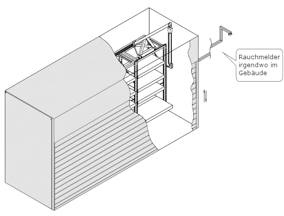Prinzip eines einreihigen Schwerlastregales mit ausziehbaren Fachböden und aufgebautem fahrbarem Hebezeug, eingebaut in einen Feuerschutzcontainer Typ FC 2-D |