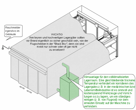![]() Die Devise muß lauten, wenn es brennt darf der Schaden nur so gering wie möglich sein. Deshalb empfiehlt es sich teure, unersetzliche Gegenstände in Brandschutzkammern zu lagern ! |