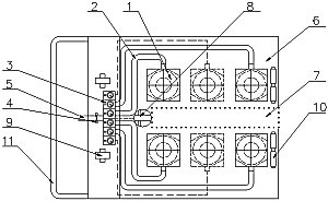 1. Luftkissengleitmodul 2. Luftzuleitung 3. Steuerteile mit Druckregler, Ventile und Manometer 4. Absperrventil 5. Lufthauptanschluß 6. Trägerholme 2 Stk. oder Trägerplatte 1 Stk. 7. Punktiertes Feld entfällt, wenn Gerät mit 2 Trägerholme (Hubwagenprinzip) gebaut wird 8. Führungsrolle 9. Lenkrollen (vorne) 10. Bockrollen (hinten) 11.Schiebebügel |