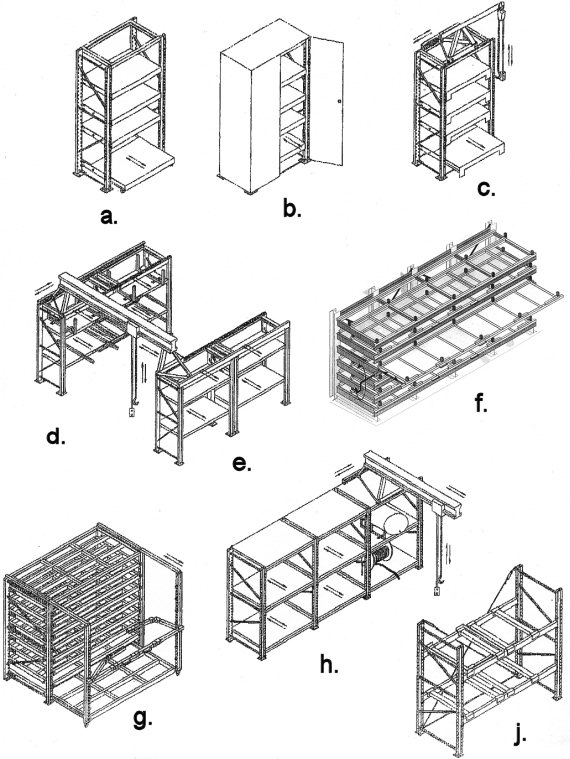 - Spezialregal mit ausziehbaren Fachböden für schwerste Lasten, z.B. Platten, Tafeln, Profile oder sonstige schwere, großflächige Lagergüter. Auf Wunsch mit fahrbarem Hebezeug aufgebaut auf dem Regal.