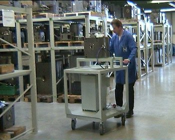 Der Kreis schließt sich mit dem Werkzeugtransportwagen mit integriertem und aufgebautem Formenvorheizgerät. Das Werkzeug, das demnächst in die Spritzgießmaschine eingebaut werden soll, wird vom Formenlager abgeholt |
